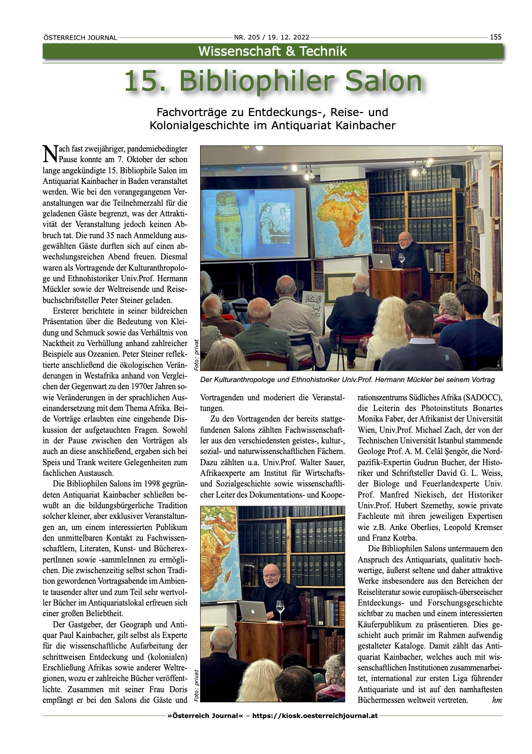 Nach fast zweijähriger, pandemiebedingter Pause konnte am 7. Oktober der schon lange angekündigte 15. Bibliophile Salon im Antiquariat Kainbacher in Baden veranstaltet werden.